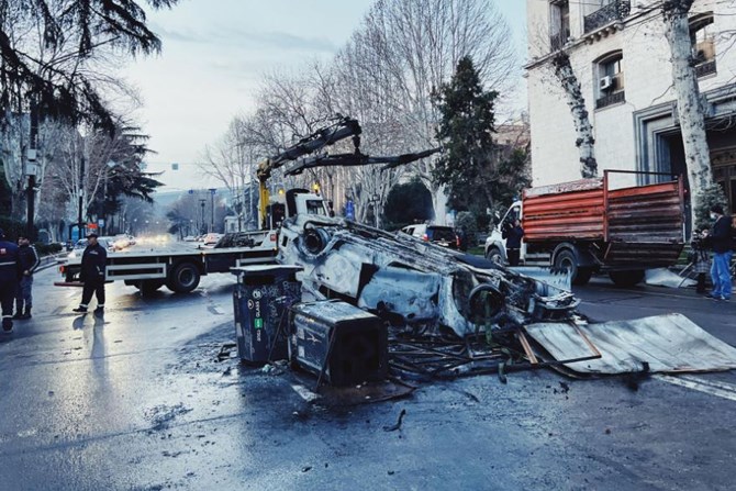 პოლიციამ არაერთხელ სცადა დაძაბული სიტუაციის განმუხტვა – აგრესიული პირები პარლამენტის მიმდებარე ტერიტორიიდან გაარიდა და აქციის მონაწილეებს მშვიდობიანად დაშლისკენ მოუწოდა, თუმცა ისინი კვლავ განაგრძობდნენ ძალადობრივ ქმედებებს და არ ემორჩილებოდნენ სამართალდამცველთა კანონიერ მოთხოვნებს. რუსთაველის გამზირზე შეკრებილებმა დაიწყეს პოლიციელების მიმართულებით ე.წ. "მოლოტოვის კოქტეილების", ქვების, ხის ძელებისა და სხვა საგნების სროლა. აქციის მონაწილეებმა დააზიანეს, ამოატრიალეს და ცეცხლი წაუკიდეს შინაგან საქმეთა სამინისტროს კუთვნილ რამდენიმე ავტომანქანას, დააზიანეს განსაკუთრებულ დავალებათა დეპარტამენტის ავტობუსი, სახანძრო ავტომანქანა, რუსთაველის გამზირზე მდებარე შენობების ფასადები, ჩაამსხვრიეს ვიტრინები. რუსთაველის გამზირზე შეკრებილებმა დააზიანეს თბილისის მერიის სამსახურების საკუთრებაში არსებული მატერიალური ქონება, მათ შორის ცეცხლი წაუკიდეს ქუჩაში მდგარ ურნებს, დაამტვრიეს სკამები და საზოგადოებრივი ტრანსპორტის მოსაცდელები.