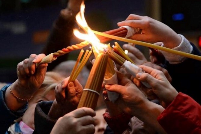 მაცხოვრის საფლავზე ცეცხლის გარდამოსვლის რიტუალი წელს 15:55 საათზეშესრულდა.